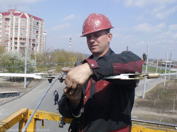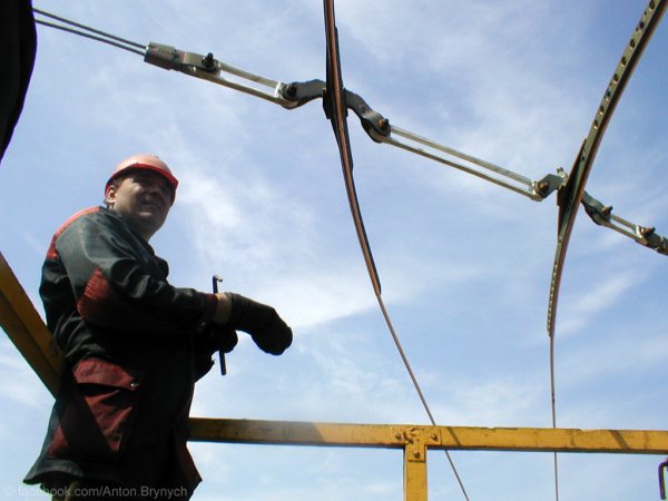 25 квітня 2005 року. Монтаж несучого тросу на вулиці Черняка.