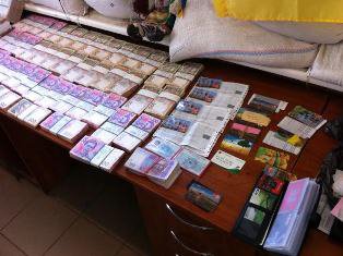 У ході огляду салону легковика міліціонери виявили велику партію грошей – пачки з гривнями та доларами США, які були заховані скрізь: у надувному матраці, під сидінням, в жіночій сумочці, в бардачку, в багажному відділенні, в запасці. Крім того, серед грошей були ще й банківські картки кількох банків з пін-кодами у кількості понад 20 штук, видані на різні прізвища та понад півсотні комплектуючих до мобільних телефонів. Документів на перевезення валютних цінностей для перевірки 32-річний житель Донецька не представив. При собі мав посвідчення завідуючого дільницею інкасації перевезення валютних цінностей Ощадбанку м. Донецьк.