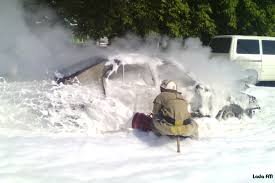Легкове авто невідомої марки влетіло під вантажівку. Після удару фура з'їхала з дороги, а легковик повністю згорів.