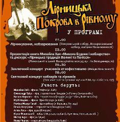 Другий етнічний фестиваль «Лірницька Покрова в Рівному» відбуватиметься у нашому місті. У програмі фестивалю: лірникування та кобзарювання на майданах та біля церков міста, презентація книги професора, доктора мистецтвознавства Михайла Хая «Микола будник і кобзарство», фотовиставка , виставка музичних інструментів та дискурс «Лірницька традиція Волині і Полісся» в Рівненському ПДМі, заключний концерт на Майдані Незалежності та святковий концерт в Залі камерної та органної музики РОФ.