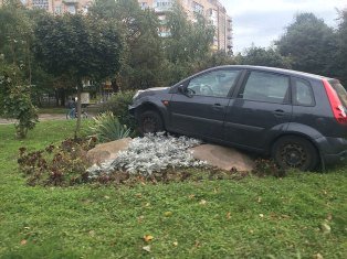 Біля готелю Мир припаркований Шевроле Авео з пошкодженою лівою стороною та екіпаж ДАІ. Вочевидь водій форда допустив зіткнення з припаркованою автівкою та втікав з місця пригоди.