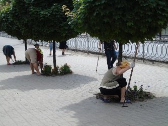 У центральній частині міста комунальне підприємство "Трест зеленого господарства" Рівненської міської ради висаджував квіти та займався озеленення пішохідних зон.