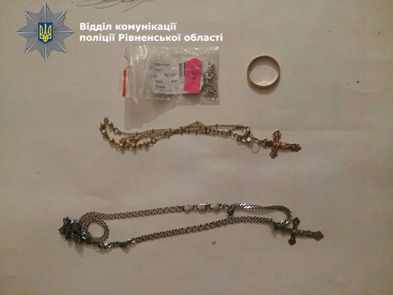 Потерпіла виявила відсутність золотих та срібних виробів і відразу повідомила правоохоронців. У цей час група реагування патрульної поліції Здолбунівського відділення перебувала неподалік та за лічені хвилини прибула на виклик. Жінку, яка не встигла сісти у авто, поліцейські затримали на одній із вулиць. А вже близько 20 години у райцентрі правоохоронці виявили й автомобіль «ВАЗ-2105», яким пересувався зловмисник. У кишені 25-річного жителя Закарпаття поліцейські вилучили три золотих та два срібних персня, дві золоті сережки і два срібних ланцюжки.