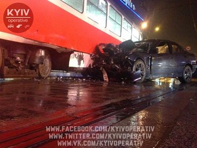 В результаті ДТП, троє з "німця" постраждали, оскільки не були пристебнуті. Їх госпіталізували в БСП. Світлофори працювали справно. Водій трамвая рухався на дозволений сигнал. На місці працює #СОГ і екіпажі патрульної поліції." - повідомляє Київ оперативний на своїй сторінці у ФБ.