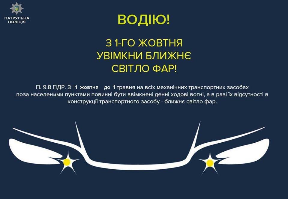 ((https://www.facebook.com/RivnePolice/)(Патрульна поліція Рівного)) нагадує водіям про обов'язкове увімкнення ближнього світла фар поза населеними пунктуми з 1 жовтня.