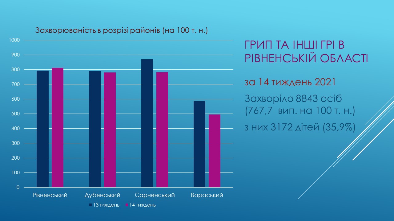 На Рівненщині протягом 14 тижня 2021 року на грип та інші гострі респіраторні інфекції (ГРІ) захворіло 8843 особи, з них 3172 (35,9%) дитини.