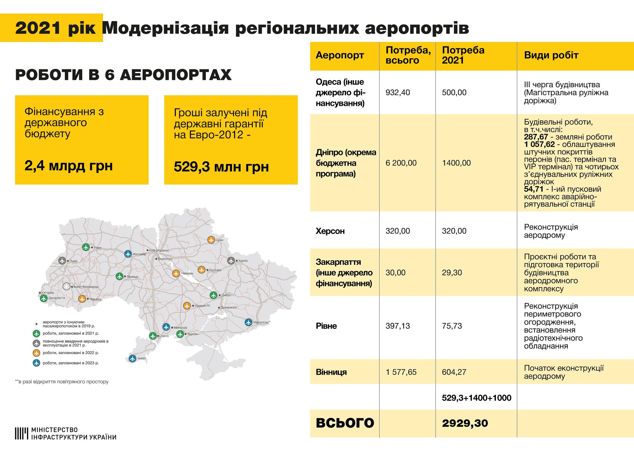 «Схвалений бюджет на 2021 рік дозволить нам продовжити модернізацію регіональних аеропортів у наступному році. З 2,4 млрд грн загальних коштів 1,4 млрд грн буде спрямовано на будівництво нового аеродрому в Дніпрі, 1 млрд грн – на аеропорти у Рівному, Херсоні та Вінниці», - зазначив Владислав Криклій.